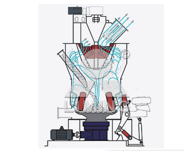 電動機(jī)通過減速裝置帶動磨盤轉(zhuǎn)動,同時(shí)熱風(fēng)從進(jìn)風(fēng)口進(jìn)入磨機(jī)內(nèi),物料從進(jìn)料口落在磨盤中央,磨輥在施壓裝置產(chǎn)生的粉磨力作用下碾壓置于磨盤上的物料。磨輥不繞地面垂直線公轉(zhuǎn),但在物料阻力作用下繞自身的軸自轉(zhuǎn),由于離心力的作用,物料向磨盤邊緣移動,經(jīng)過磨盤上的環(huán)形槽時(shí),受到磨輥的碾壓而粉碎,并繼續(xù)向磨盤邊緣移動,在磨盤邊緣的環(huán)形區(qū)域被自下向上的氣流帶至位于上部的分級裝置,經(jīng)過分離器時(shí),在導(dǎo)向葉片和轉(zhuǎn)子的作用下,粗料下落到磨盤上重磨,細(xì)粉隨氣流一起出磨機(jī),在系統(tǒng)收塵裝置中收集,即為成品。物料在與氣體接觸過程中被烘干,達(dá)到所要求的產(chǎn)品水分。通過調(diào)節(jié)葉片的角度或分離器轉(zhuǎn)子轉(zhuǎn)速,便可得到不同細(xì)度的產(chǎn)品。